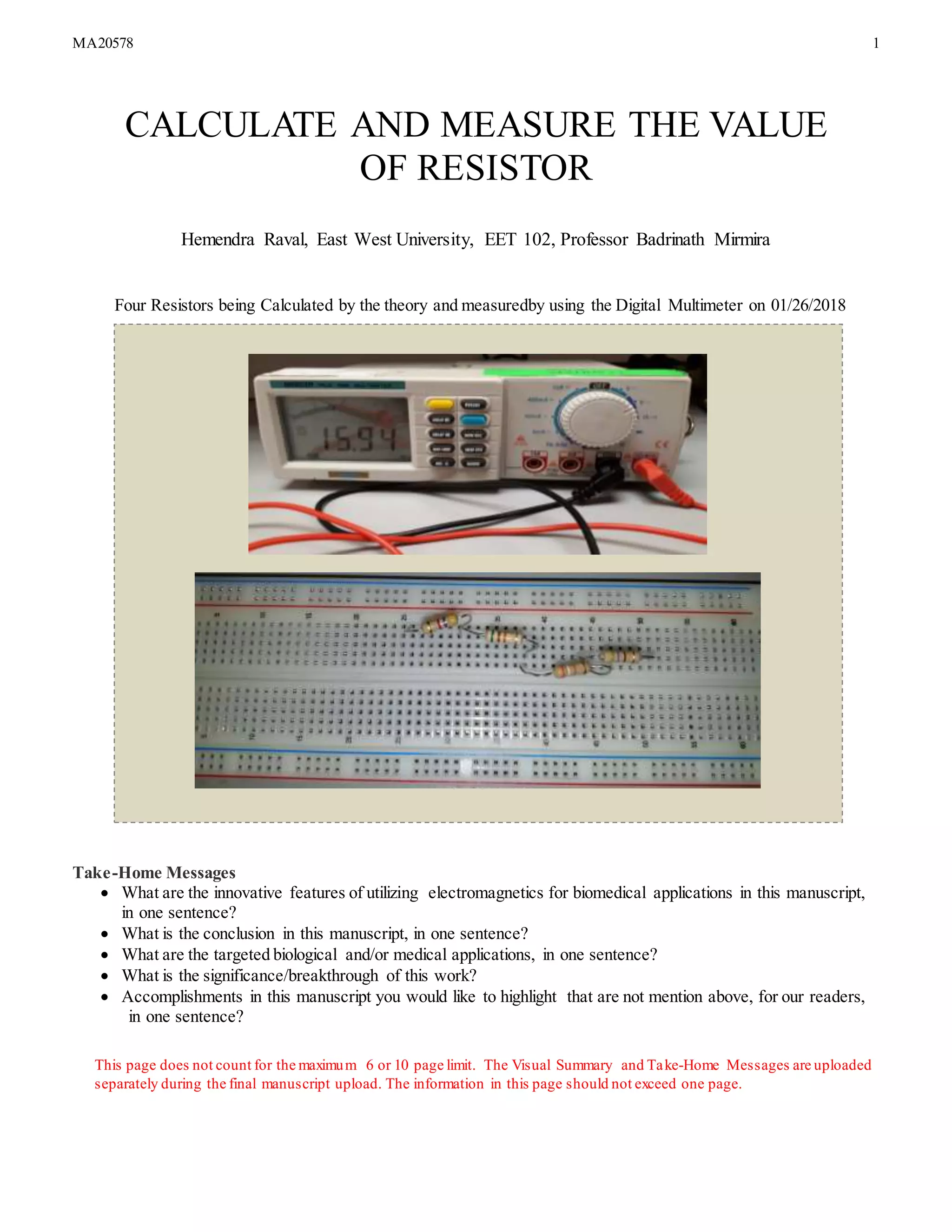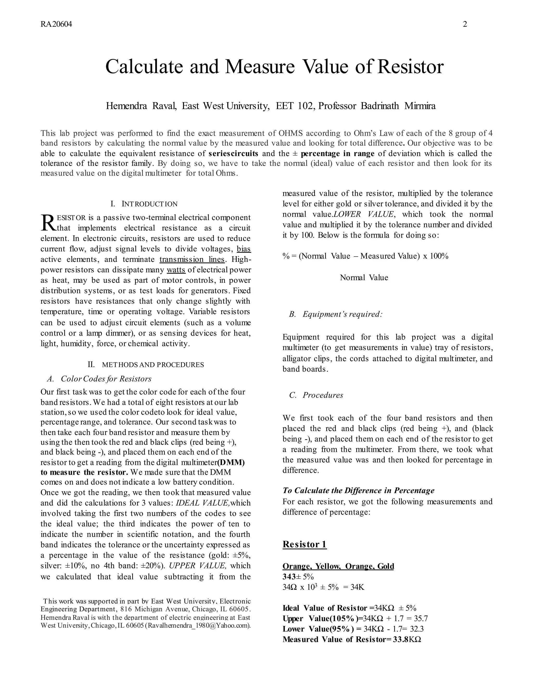 This document summarizes an experiment to measure the resistance of 4 resistors using a digital multimeter. It describes calculating the ideal, upper, and lower resistance values based on each resistor's color bands. For each resistor, it records the color bands, ideal value, tolerance range, measured value, difference between measured and ideal values, and percentage difference. All 4 resistors were within the rated tolerance range. The conclusion states the document found the specified 3-band resistor for the next lab experiment but does not give further details.