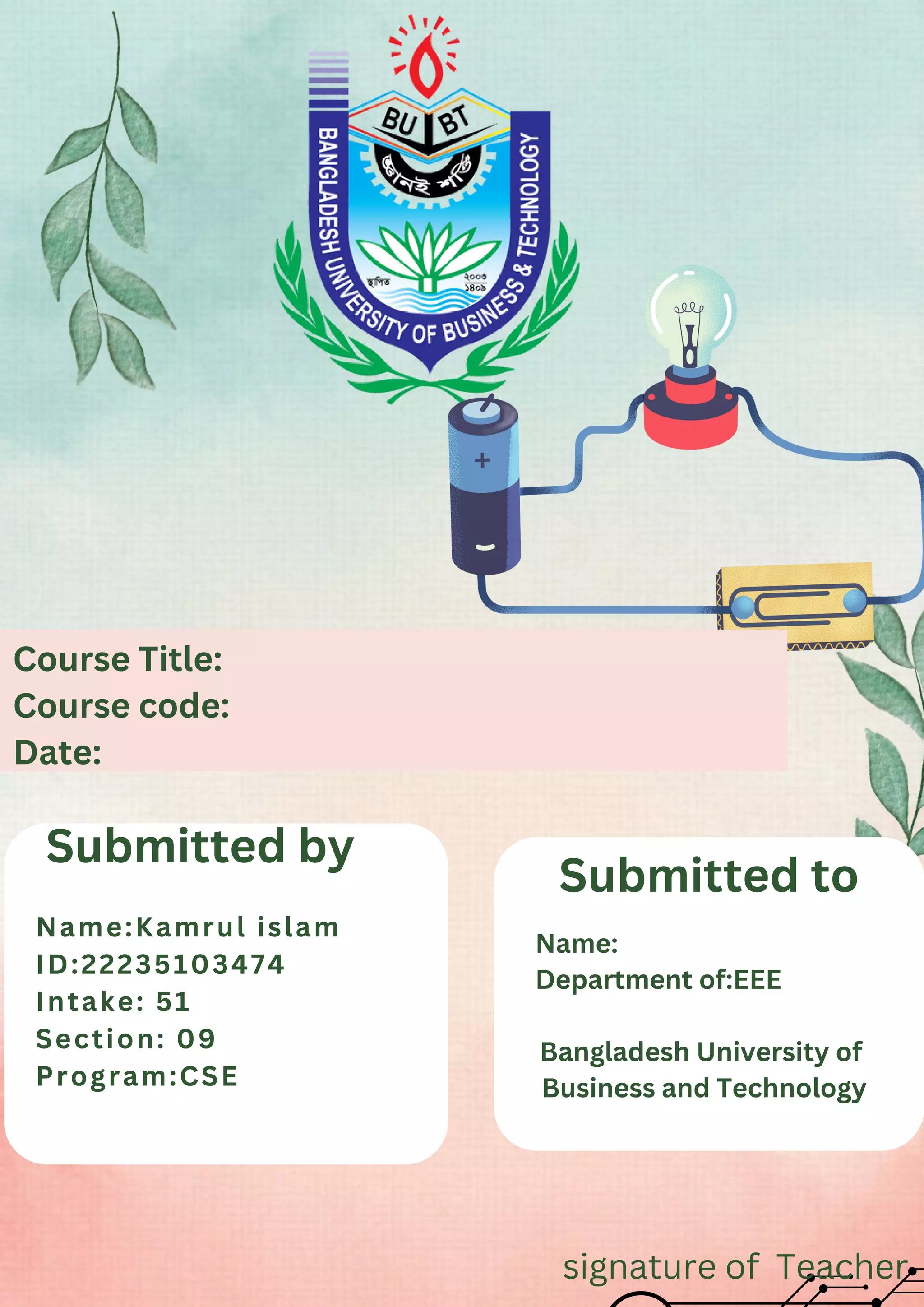 This document contains information about a student named Kamrul Islam enrolled in the Computer Science and Engineering program at Bangladesh University of Business and Technology. It lists his course code, date, intake number, section number and student ID. The document was submitted by Kamrul Islam to his teacher in the Electrical and Electronic Engineering department.