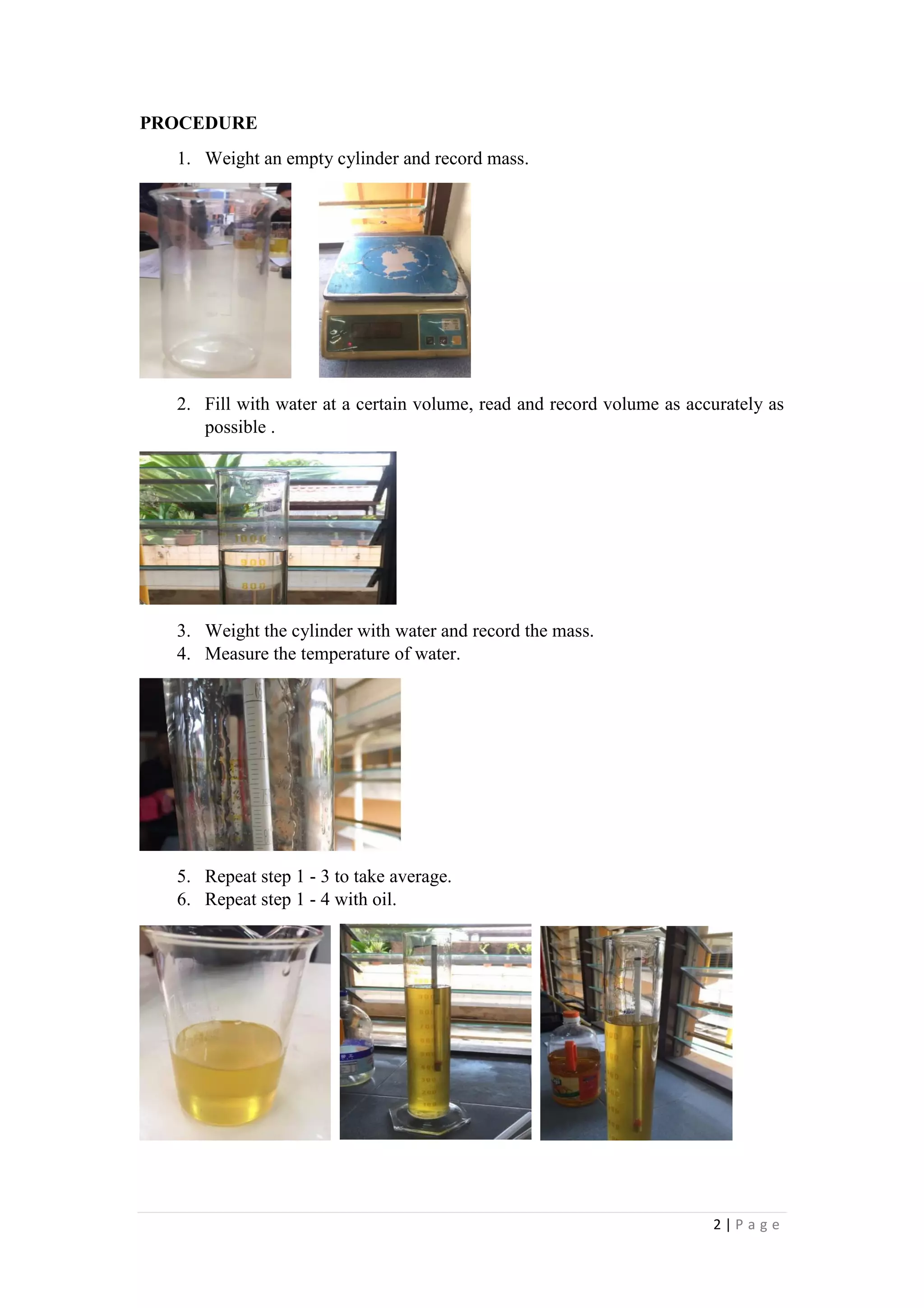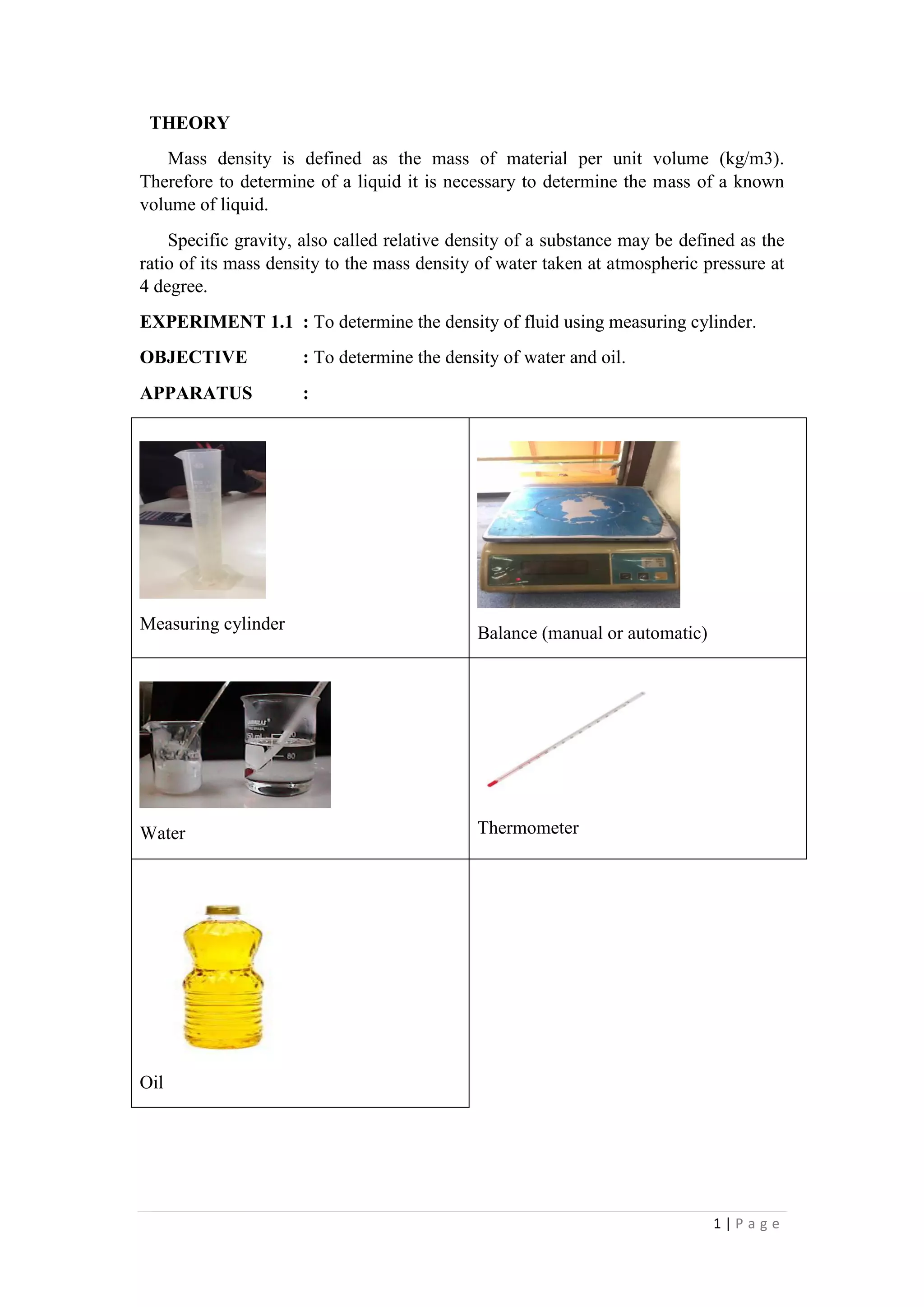 1. The document describes four experiments to determine the density of water and oil using different methods: a measuring cylinder, density bottle, Eureka can, and hydrometer.