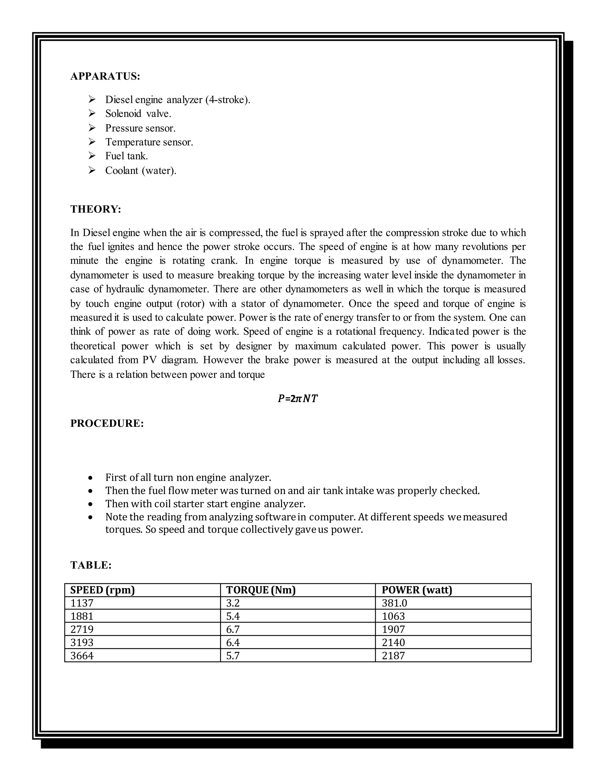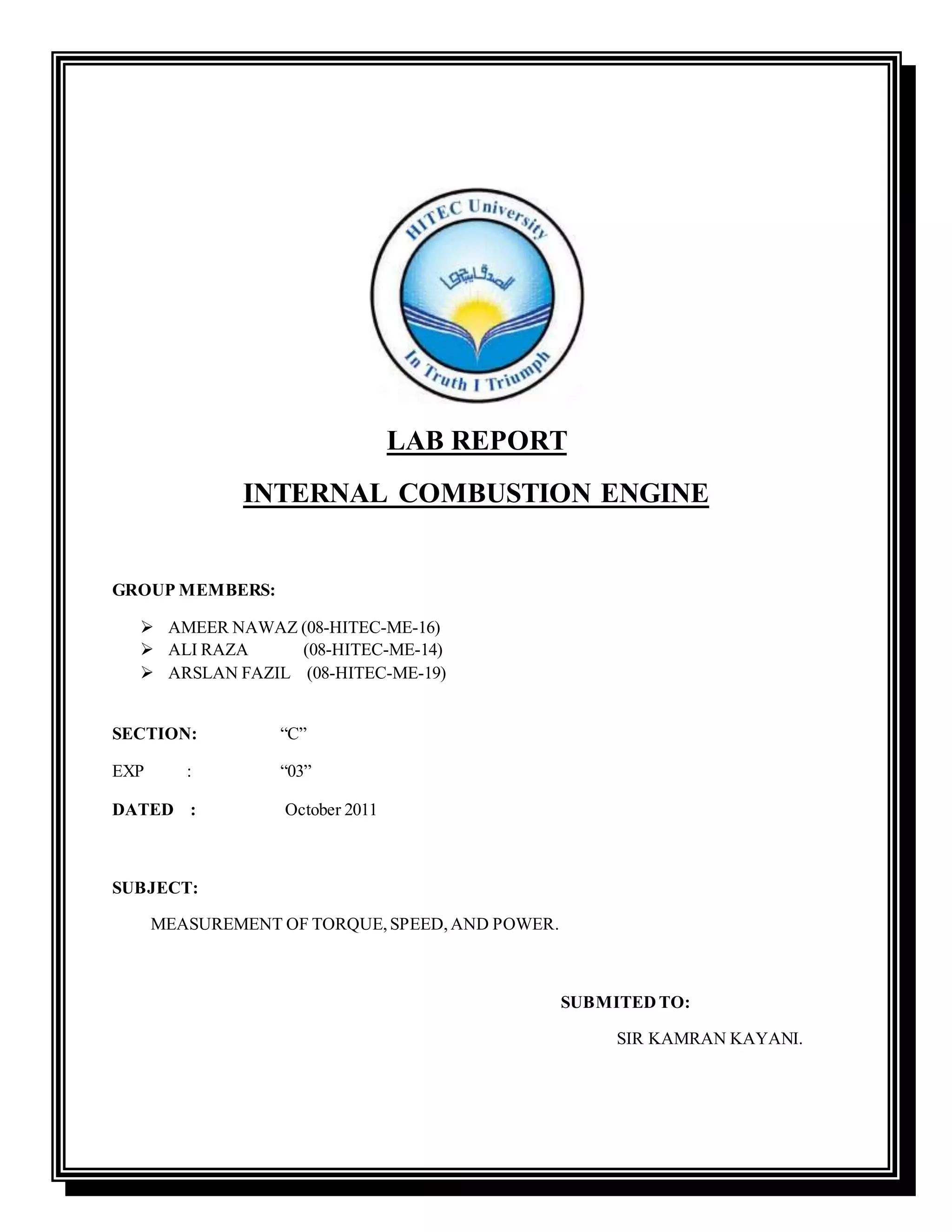 The lab report summarizes an experiment measuring the torque, speed, and power of a 4-stroke diesel engine. A diesel engine analyzer and other sensors were used to collect data at different engine speeds. Torque increased with speed up to a point then began decreasing, while power reached a peak then decreased. Graphs of torque vs speed and power vs speed were included. The report concluded the experiment was successfully performed to observe the engine analyzer operation and relationships between torque, speed, and power.
