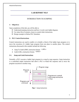 This document discusses jump instructions in PLC ladder logic. Jump instructions allow a PLC program to break its normal sequential execution and move to another part of the program. The key points covered are: