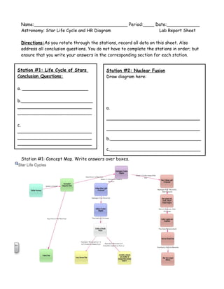 This document appears to be a lab report sheet for a student to record information from various stations exploring astronomy concepts including the life cycle of stars, classifying stars using the Hertzsprung-Russell diagram, and the future of the sun. The student is instructed to record data, draw diagrams, and answer conclusion questions at each station.