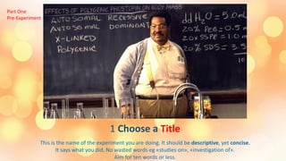 This document outlines the key sections and content that should be included in a lab report. It discusses including an informative title, abstract, introduction with purpose and hypothesis, detailed methods section, results with organized data, and a conclusion discussing whether the hypothesis was supported and improvements for the experiment. The lab report provides a clear and detailed analysis of the procedures, data, and findings of an experiment.
