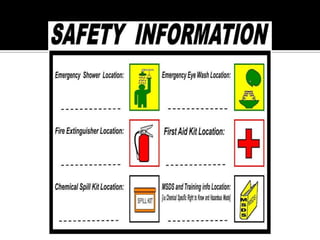 This document discusses laboratory safety protocols. It outlines proper procedures for responding to accidents, including providing first aid, documenting the incident, and notifying supervisors. The document advises against loose clothing, dangling jewelry, open-toed shoes, and having hair down in the lab due to safety risks. It emphasizes behaving respectfully and carefully with equipment, and cleaning workspaces thoroughly. The document also explains common safety labels, required personal protective equipment like goggles and gloves, and stresses the importance of proper disposal of hazardous materials. Overall, it emphasizes practicing safety conscientiously in the laboratory.