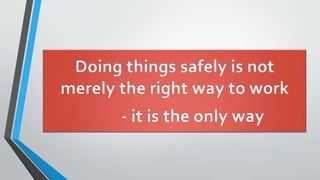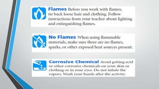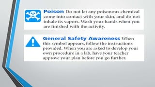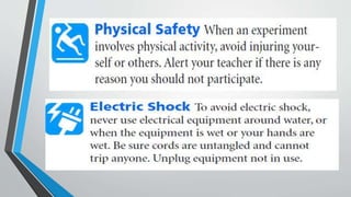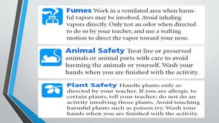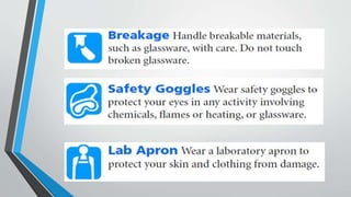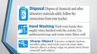 The document provides guidance on laboratory safety. It emphasizes the importance of following safety precautions to avoid accidents from hazards in the laboratory. Some key safety rules include wearing protective equipment like goggles and aprons, tying back long hair, avoiding loose clothing, not eating or drinking in the lab, washing hands after handling chemicals, asking the teacher if unsure of anything, and notifying the teacher immediately if any accidents occur.