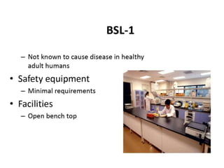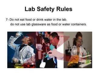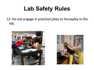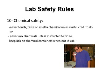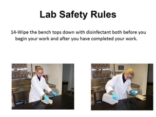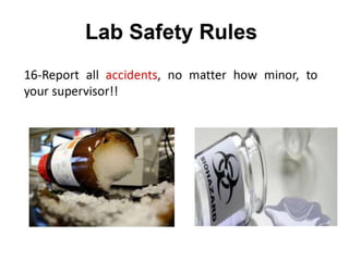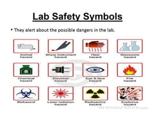 This document outlines the learning outcomes and contents of a lab safety course. The course aims to teach students how to work safely in a science lab by learning basic safety rules like washing hands, following directions, and keeping the lab clean. It will also cover wearing appropriate attire, what to do in an accident, hazards exposure, and collecting and processing specimens. The document lists general lab rules and protection of staff as topics to be covered.