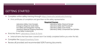 This document provides an overview of laboratory safety training requirements for a new employee joining the Zaikina Lab at Iowa State University. It outlines that the employee must complete online safety training courses and review lab-specific standard operating procedures. The employee is assigned to work in rooms 2221, 2241, and 2241A under the supervision of Dr. Julia Zaikina. Personal protective equipment including lab coats, gloves and safety glasses must be worn at all times in the lab. Waste disposal procedures and what to do in the event of an emergency are also summarized.