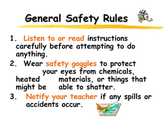 This document outlines various lab safety rules and procedures. It discusses general safety rules like wearing safety goggles and notifying the teacher of any accidents. It also covers glassware safety like using tongs for hot objects and not placing hot glassware in water. Chemical safety procedures include wearing protective equipment when handling hazardous chemicals and never tasting or smelling chemicals. Electrical, heating, and first aid safety procedures are also described. The overall message is to follow all safety guidelines carefully to prevent injuries in the lab.