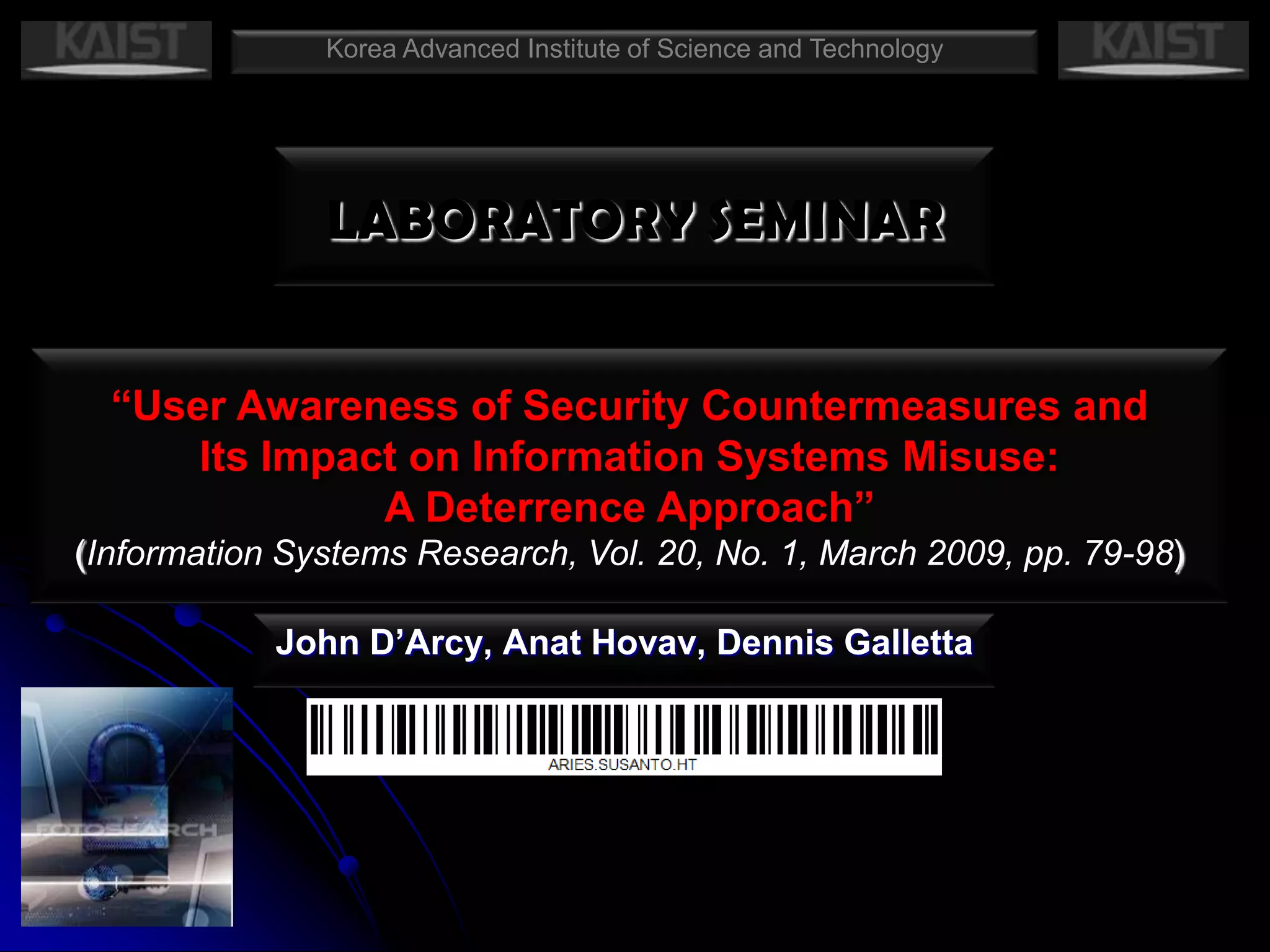 This document summarizes a research paper that empirically tests a model based on general deterrence theory regarding how user awareness of security countermeasures impacts perceptions of punishment certainty and severity for information systems misuse. The study developed hypotheses about the relationships between security policies, security education/training/awareness programs, computer monitoring, perceived certainty and severity of sanctions, and intentions for systems misuse. Data was collected through an online survey of professionals and analyzed using partial least squares and other statistical techniques. The results provided support for most of the hypotheses and showed that security countermeasures influence perceptions of punishment, which impact misuse intentions.