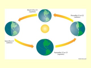 The document discusses Earth's relationship with the Sun. It explains that Earth revolves around the Sun in an elliptical orbit over the course of 1 year, and rotates on its axis over the course of 1 day. Due to Earth's axial tilt of 23.5 degrees and its revolution around the Sun, the Sun's rays strike different parts of Earth at different angles over the course of the year, causing the seasons. An analemma diagram can be used to determine the position of the subsolar point and solar altitude for any location on Earth on a given date.