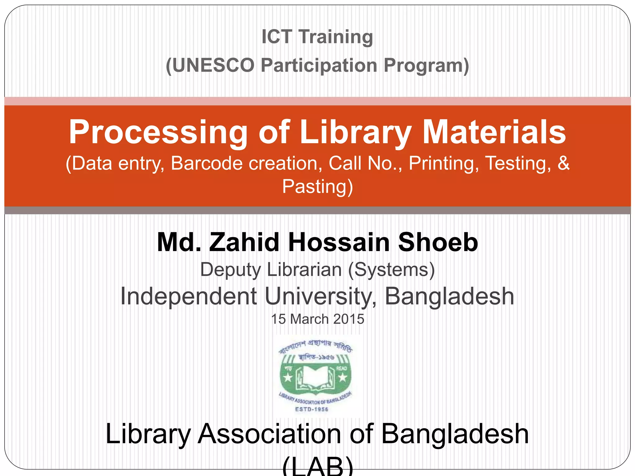 The document outlines the process of library material handling including data entry, barcode creation, and cataloging, as essential steps for organizing and managing library collections. Key components discussed are accession numbers, circulation cards, and the importance of bibliographic description for efficient library services. It also highlights the significance of barcodes for identifying materials and the methods for their creation and application within the library system.