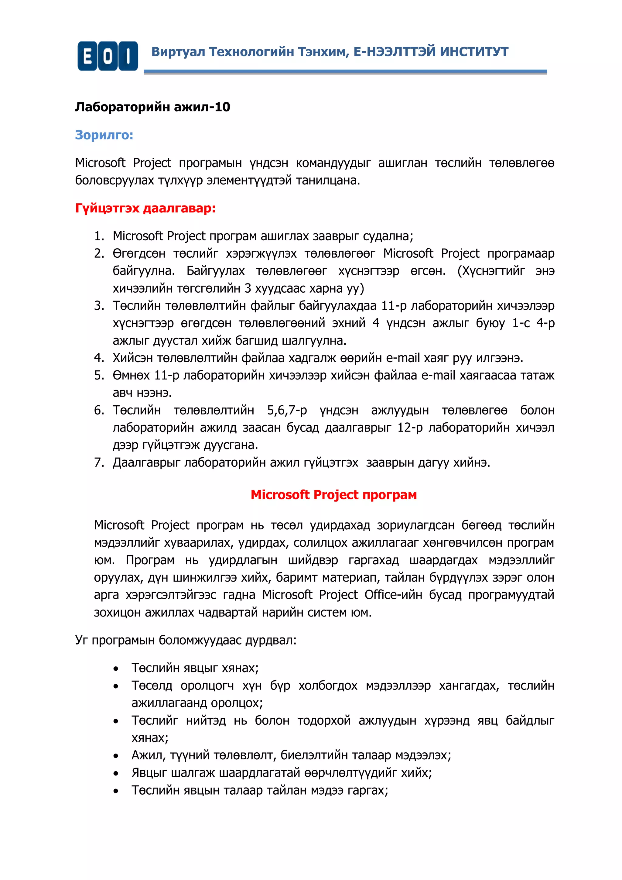 1. Microsoft Project програм ашиглах зааврыг судална;