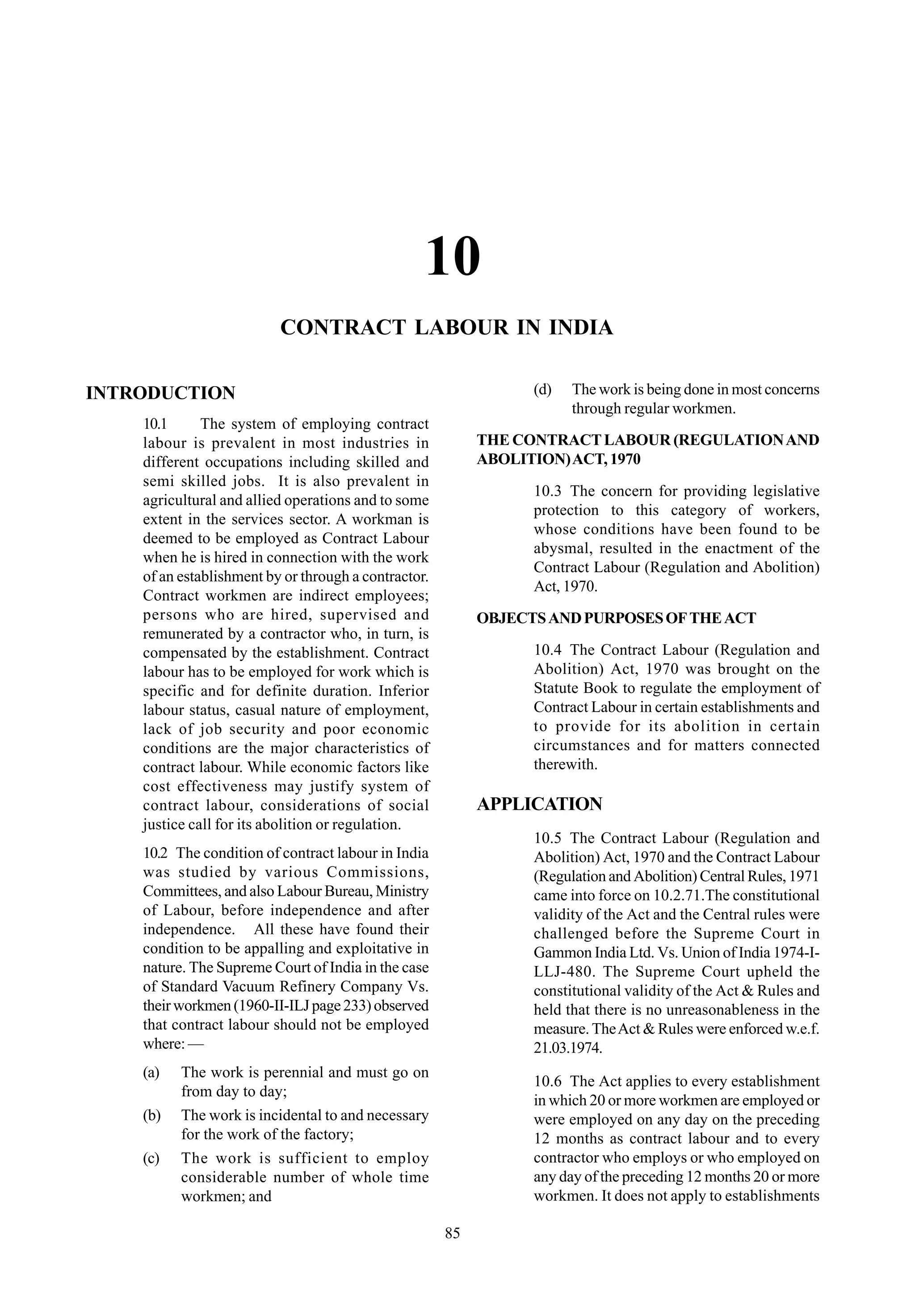 The document discusses the Contract Labour (Regulation and Abolition) Act of 1970 in India. It provides context on the prevalence of contract labor, the poor conditions they faced, and the act's purpose to regulate contract labor and abolish it in some circumstances. It summarizes key aspects of the act including its application, requirements for registration of establishments and licensing of contractors, welfare provisions for contract workers, payment of wages, and penalties for noncompliance. It also discusses views on reforming the act from employer associations who wish for more flexibility, and trade unions who oppose contracting of permanent jobs.