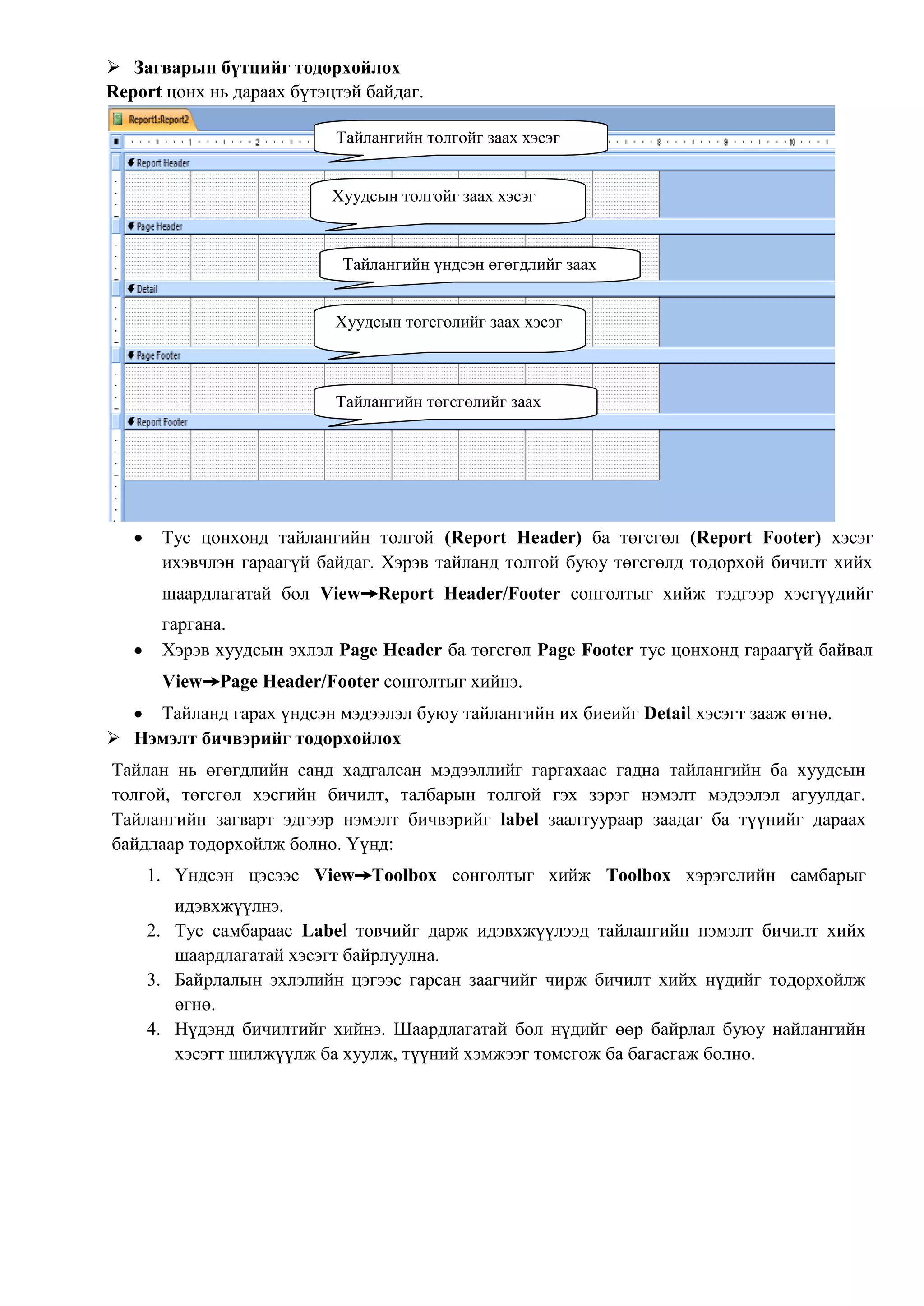 Тайлангийн эх үүсвэрболох тодорхой table буюу query –г сонгоно. Тайлангийн загварыг тодорхойлох<br />Тус хэсэгт тайлангийн загварыг Design View хэрэгслээр хэрхэн тодорхойлж болохыг тайлбарлана. New Table ➙ Design View сонголтоор Report цонх гарах ба үүнд тайлангийн загварыг тодорхойлно. <br />Загварын бүтцийг тодорхойлох Report цонх нь дараах бүтэцтэй байдаг. <br />Хуудсын төгсгөлийг заах хэсэгТайлангийн үндсэн өгөгдлийг заах хэсэгХуудсын толгойг заах хэсэгТайлангийн толгойг заах хэсэгТайлангийн төгсгөлийг заах хэсэг<br />Тус цонхонд тайлангийн толгой (Report Header) ба төгсгөл (Report Footer) хэсэг ихэвчлэн гараагүй байдаг. Хэрэв тайланд толгой буюу төгсгөлд тодорхой бичилт хийх шаардлагатай бол View➙Report Header/Footer сонголтыг хийж тэдгээр хэсгүүдийг гаргана. - 11.