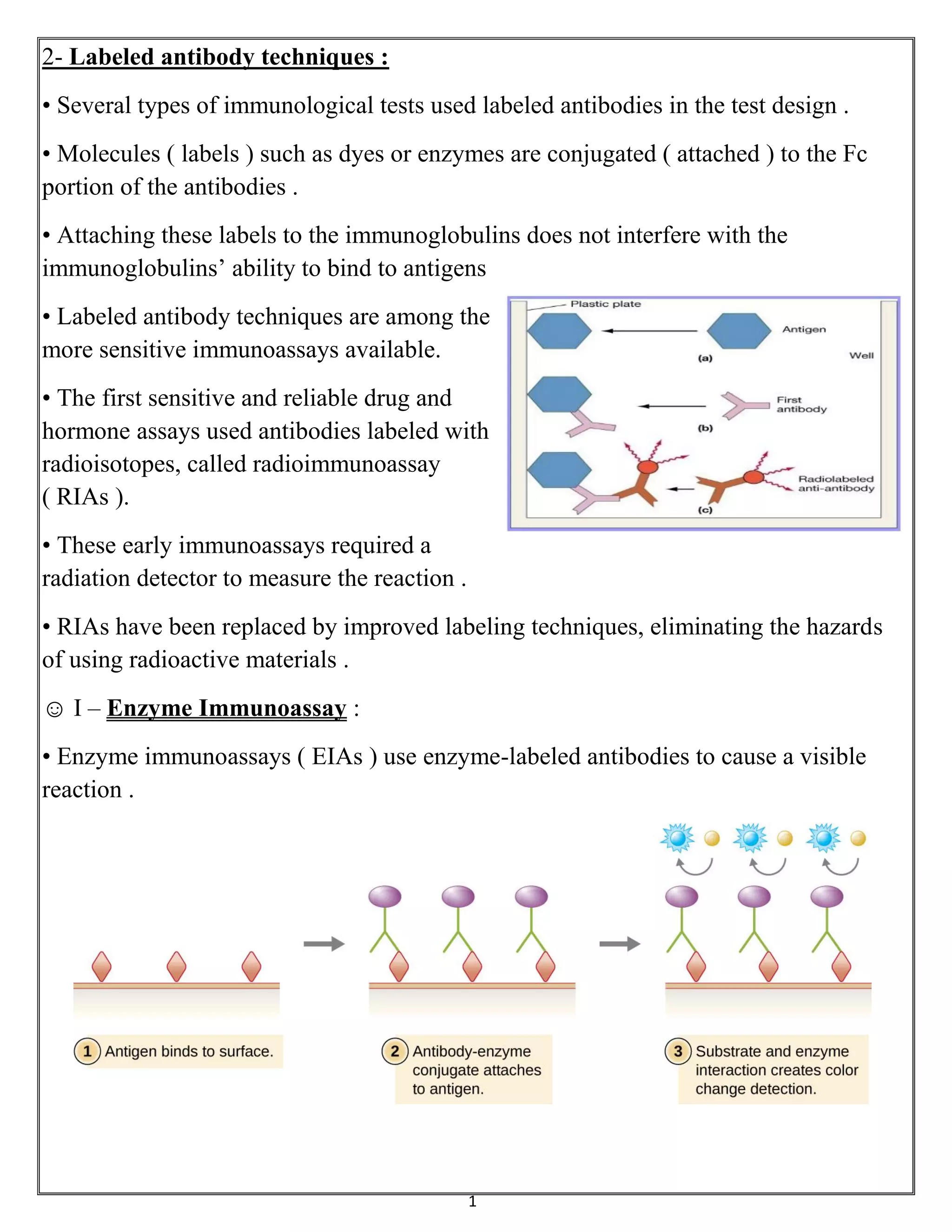 Labeled antibody techniques use antibodies conjugated to labels like enzymes or dyes. Enzyme immunoassays (EIAs) use enzyme-labeled antibodies to generate a visible reaction with a substrate. A common type of EIA is the enzyme-linked immunosorbent assay (ELISA), which uses an enzyme-linked antibody or antigen to detect specific proteins. There are several variations of ELISA that can qualitatively or quantitatively detect antigens or antibodies in samples.
