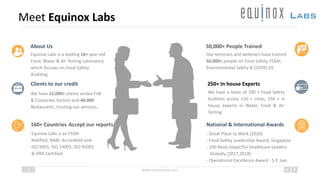 The document outlines the Food Safety and Standards (Labelling and Display) Regulations, 2020, detailing requirements for food labelling in India, including mandatory information to be displayed on pre-packaged foods. It emphasizes the importance of accurate labeling for consumer safety, trust, and compliance with legal standards, such as nutritional information, allergen declarations, and manufacturer details. Additionally, it highlights Equinox Labs' role as a prominent food safety auditing and testing laboratory with extensive experience and training initiatives in the industry.