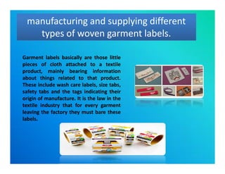 The document outlines the importance of labeling and packaging in the textile and healthcare industries, emphasizing the necessity for accurate information on garment and healthcare labels. It discusses the use of fix-a-form labels as an effective marketing tool and the thermal transfer printing process for creating durable labels. Additionally, it provides contact information for Toppan Win Label Co., Ltd. in Hong Kong.