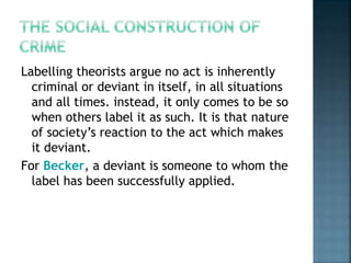 Labelling theory argues that acts are not inherently criminal, but become defined as deviant when labeled as such by others in society. For labelling theorists like Becker, a deviant is someone who has successfully been given the label of deviant. Moral entrepreneurs play a role in leading campaigns to change laws in ways that create new groups of outsiders and expand the power of social control agencies. Whether someone is arrested and charged depends on factors like their interactions with these agencies and characteristics like class, gender, and ethnicity. Lemert distinguishes between primary deviance, which involves acts that go unnoticed and unlabeled, and secondary deviance, where the label itself leads to further deviant acts and identity.