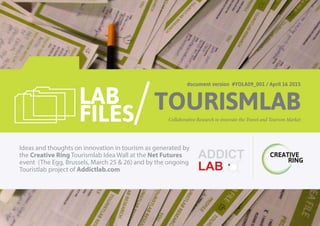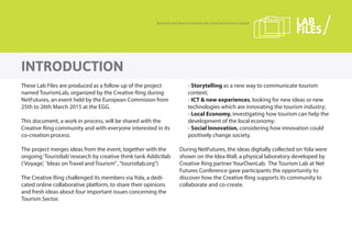This document summarizes ideas generated by participants in the Creative Ring Tourismlab project on using storytelling to innovate tourism. Over 30 participants from different countries shared ideas on topics like using stories to promote local tourism, creating food tours based on restaurant recommendations, encouraging "fan tourism" to film and book locations, and developing mobile apps to provide audio walking tours with location-based storytelling. Many ideas involved using technology or games to engage tourists in interactive local stories.