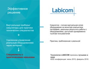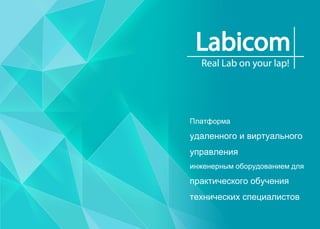 Документ описывает платформу для удаленного и виртуального управления инженерным оборудованием, которая предлагает практическое обучение технических специалистов с использованием симуляторов и дистанционного доступа к оборудованию. Платформа направлена на оптимизацию учебного процесса, снижение затрат на обучение и повышение навыков студентов с целью решения проблем в компании. Система включает создание кастомизированных обучающих курсов и использование виртуальных приборов для практических занятий.