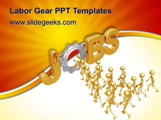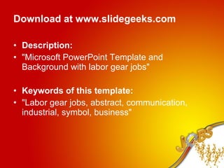 This PowerPoint template features labor gear and jobs. It provides an abstract, industrial-themed design with symbols to represent communication and business. The template can be downloaded from www.slidegeeks.com and is keywords include labor gear jobs, abstract, communication, industrial, and symbol.