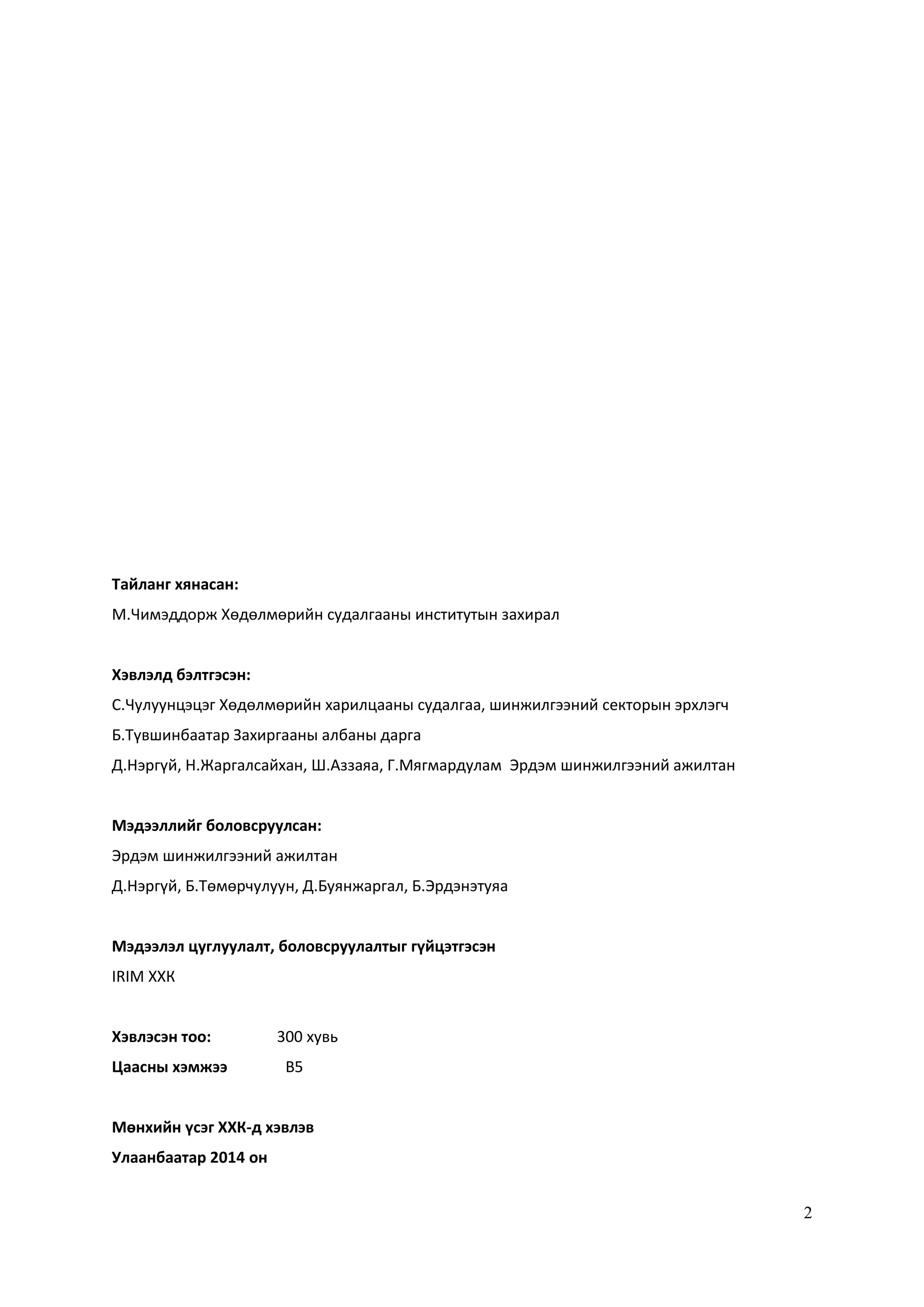түгээмэл байна. Ажиллагчдын тал хувь нь хамтын гэрээ хэлэлцээрийн талаар мэдээлэл муутай , хамтын гэрээний хэрэгжилт байгууллагын удирдлагаас ихээхэн хамаардаг байна. Хамтын гэрээ хэлэлцээр, эмэгтэй, хөгжлийн бэрхшээлтэй хүний хөдөлмөр эрхлэлтийн талаарх зүйл заалтуудыг харьцангуй муу хэрэгжиж байна гэж үзсэн байна. Судалгаанд оролцсон ихэнх байгууллага хөдөлмөрийн дотоод журамтай байсан ба журмын хэрэгжилт маш сайн байдаг гэж судалгаанд оролцогчид үнэлсэн. Төсвийн байгууллага, нөхөрлөл, хоршоонд болон 1-5 ажилтантай жижиг ААНБ-д дотоод журмын хэрэгжилт харьцангуй сул байсан. Хөдөлмөрийн маргааныг хөдөлмөрийн хууль шийдэж чадахгүй байна гэж судалгаанд оролцогчид үзсэн байна. Хөдөлмөрийн маргаан гарч буй гол шалтгаан нь цалин хөлс, ажил амралтын цаг, үндэслэлгүйгээр халагдсантай холбоотой байна. Хөдөлмөрийн гэрээний чанар хангалтгүй, ажлын байрны онцлогийг тусгахгүй байдгаас маргаан гарах үед бэрхшээл тулгарах тохиолдол их гардаг байна. Үйлдвэрийн осол, хурц хордлогод өртсөн, мэргэжлээс шалтгаалсан өвчнөөр өвчилсөн ажилтан болон эдгээр шалтгаанаар нас барсан ажилтны ар гэрт нөхөн олговор олгох заалт зөрчигддөг байна. Нэг нас хүртлэх нярай хүүхэд хөхүүлэх, асрах, завсарлага авах цаг гаргаж өгдөггүй, жирэмсэн эмэгтэй хүний хөдөлмөрийн харилцаа, эрүүл ахуйн нөхцлийг хангах тал дээр хангалттай арга хэмжээ авахгүй байна. Хуульд заасан тооны хөгжлийн бэрхшээлтэй хүнийг ажиллуулдаг байгууллага маш цөөн байна. Судалгаанд хамрагдсан туслах малчид хөдөлмөрийн тухай хуулийн талаарх мэдлэгээ дундаас доогуур гэж үнэлж байна. Туслах малчдын 84% аман байдлаар тохиролцон хөдөлмөрийн харилцаанд орж байгаа нь малчдын хөдөлмөрийн тухай хуулийн талаарх мэдлэг, мэдээлэл дутмаг , хөдөлмөрийн маргаан харьцангуй бага байдагтай холбоотой байна. Туслах малчдын 64% нь бэлэн мөнгөөр цалинжин, (цалингийн дундаж нь 284206 мянган төгрөг) 34% нь нийгмийн даатгалын шимтгэл төлж байна. Судалгааны дүгнэлтээс гарсан зөвлөмж : Эрх зүйн шинэчлэлийн хүрээнд: Хөдөлмөрийн хуулийн амралтын цаг, хөдөлмөрийн гэрээ, цалин хөлс тооцох зэрэг гол гол заалтуудыг тодорхой нарийвчлан тусгах Ажил олгогчийн эрх ашгийг хамгаалсан, ажиллагчдын үүргийг нэмэгдүүлсэн заалтыг түлхүү оруулж өгөх, ажилтныг ялгаварлах, давуу байдал олгож буй хэлбэрүүдийг тодорхойлох, хориглож өгөх, ажлын байрны тодорхойлолтыг нарийн гаргах, ёс зүйн хэм хэмжээг тусгаж өгөх, аюулгүй байдал, эрүүл ахуйн нөхцөл хангагдсан байх шаардлагыг чангатгаж өгөх, сахилга, хариуцлага алдсан ажиллагчдад хариуцлага тооцох зохицуулалтыг сайжруулах Хөдөлмөрийн дотоод журамтай байх заалтыг аж ахуйн нэгжүүдэд жигд хэрэгжүүлж хэвшүүлэх, Тарифын хэлэлцээрийг онцгой ач холбогдол бүхий томоохон салбар тус бүрээр гаргаж, зүйл заалтыг нарийвчлах Хөдөлмөрийн гэрээ заавал байгуулах заалтыг хэрэгжүүлэхийн тулд шинэ залуу болон ахмад настны хөдөлмөрийн онцлогийг харгалзсан нэмэлт оруулах Хөдөлмөрийн гэрээ ба ажилд орох тушаал гаргах дарааллыг нарийн зохицуулах шаардлагатай. Хөдөлмөрийн гэрээнээс гадуур нэмэлтээр