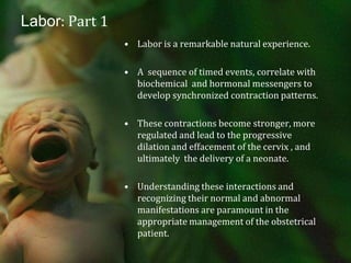 Labor is a complex process involving biochemical and hormonal changes that lead to coordinated uterine contractions, cervical dilation, and ultimately delivery. Accurate dating of pregnancy is essential for distinguishing between normal and abnormal labor conditions, with various phases of labor defined from onset to delivery of the neonate and placenta. Changes in maternal and fetal characteristics have influenced contemporary labor patterns, necessitating careful assessment to manage potential dysfunctional labor.
