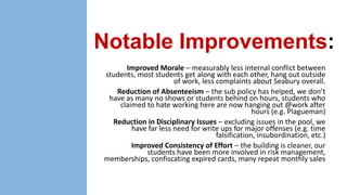 The document outlines improvements in student morale, attendance, and discipline, alongside challenges relating to group dynamics and participation. It emphasizes the importance of positive reinforcement and mentorship for developing student leaders through a structured training cycle. Proposed initiatives aim to enhance accountability and decision-making among students while managing various interpersonal issues.