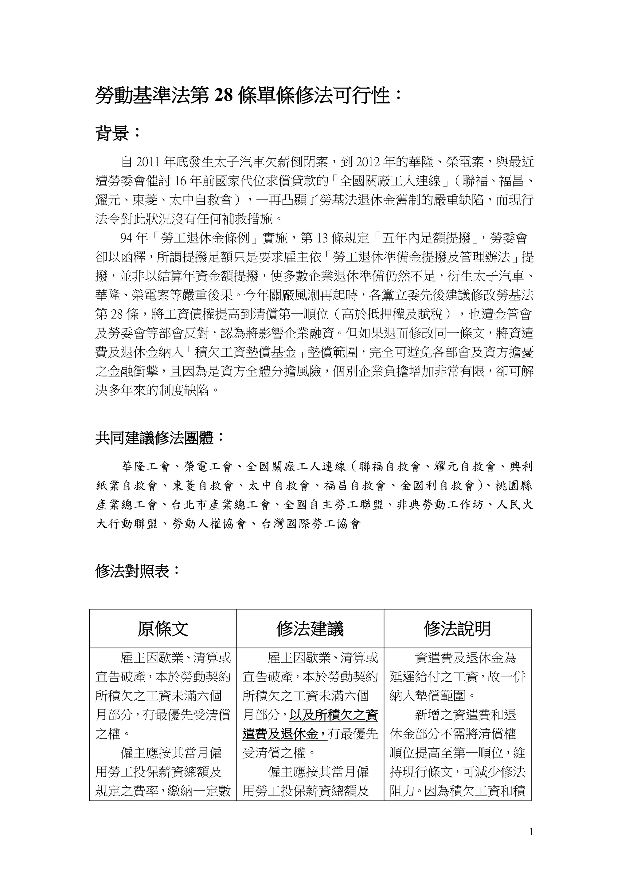 本文探讨了劳动基准法第28条修法的可行性,指出当前退休金制度存在严重缺陷,导致许多工人无法获得应得的工资、遣散费和退休金。建议将遣散费和退休金纳入积欠工资垫偿基金的范围,以减轻企业负担并解决制度缺陷,而不改变工资债权的清偿次序。通过集体分担风险的方式,可以有效保护职工权益,避免个别企业破产时造成工人失去全部退休金的风险。