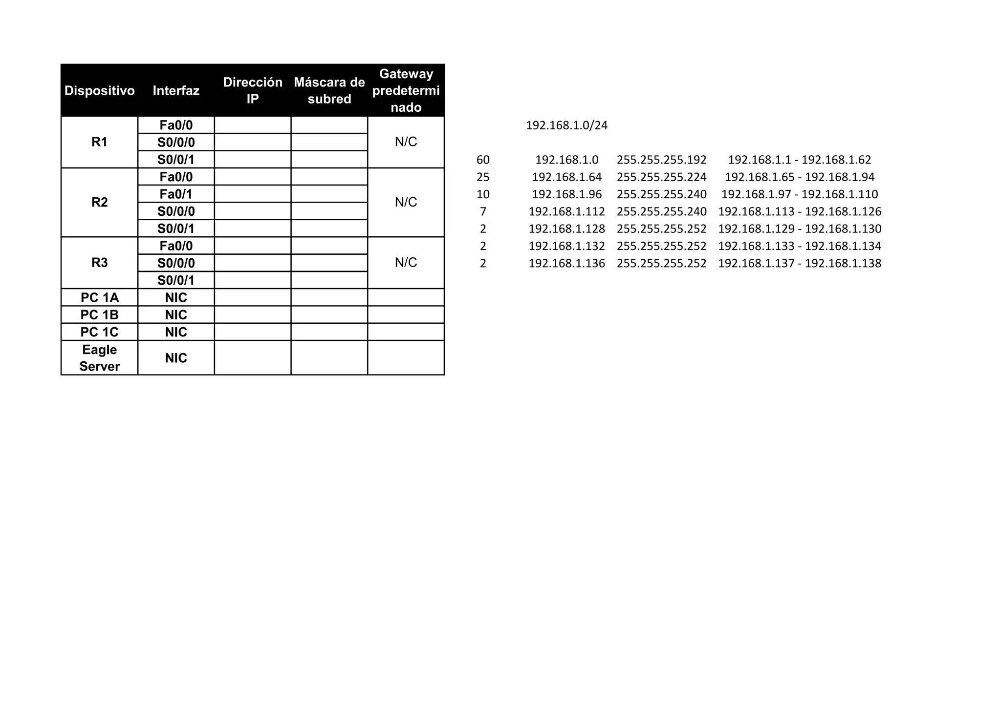 The document lists networking devices, their interfaces, IP addresses, subnet masks, and ranges of usable IP addresses in each subnet. Device R1 connects to switch R2 and R3 at interfaces Fa0/0 and S0/0/0 respectively. PCs and the Eagle server are connected across R2 and R3 with IP addresses in subnets ranging from /24 to /30 and are identified along with their interfaces.