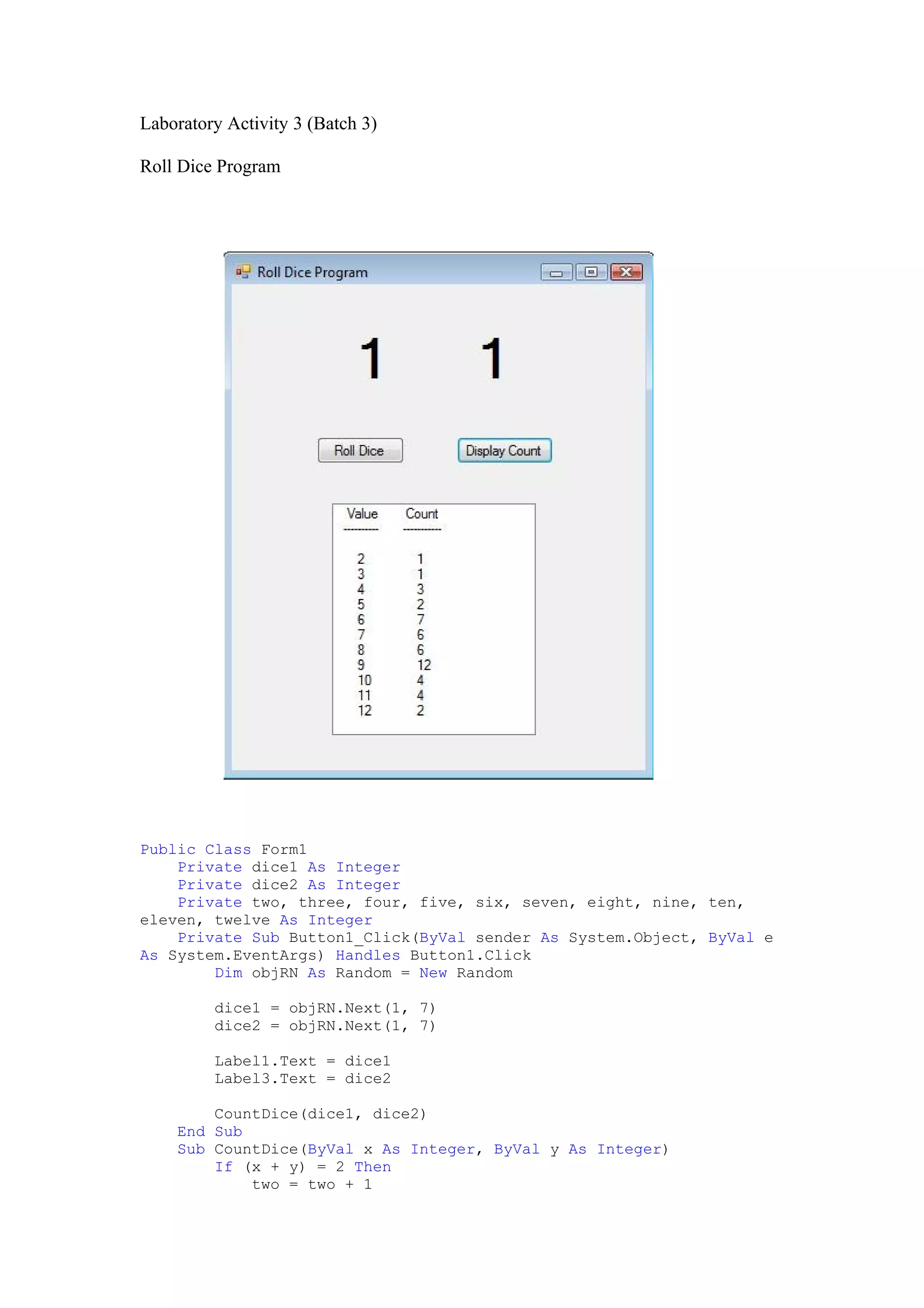 This program simulates rolling dice and counting the results. When the user clicks button1, it randomly generates values for two dice and displays them. It then calls a subroutine to count the total value in arrays tracking the frequency of each possible sum. Clicking button2 displays the results in a list box with the value and its count.