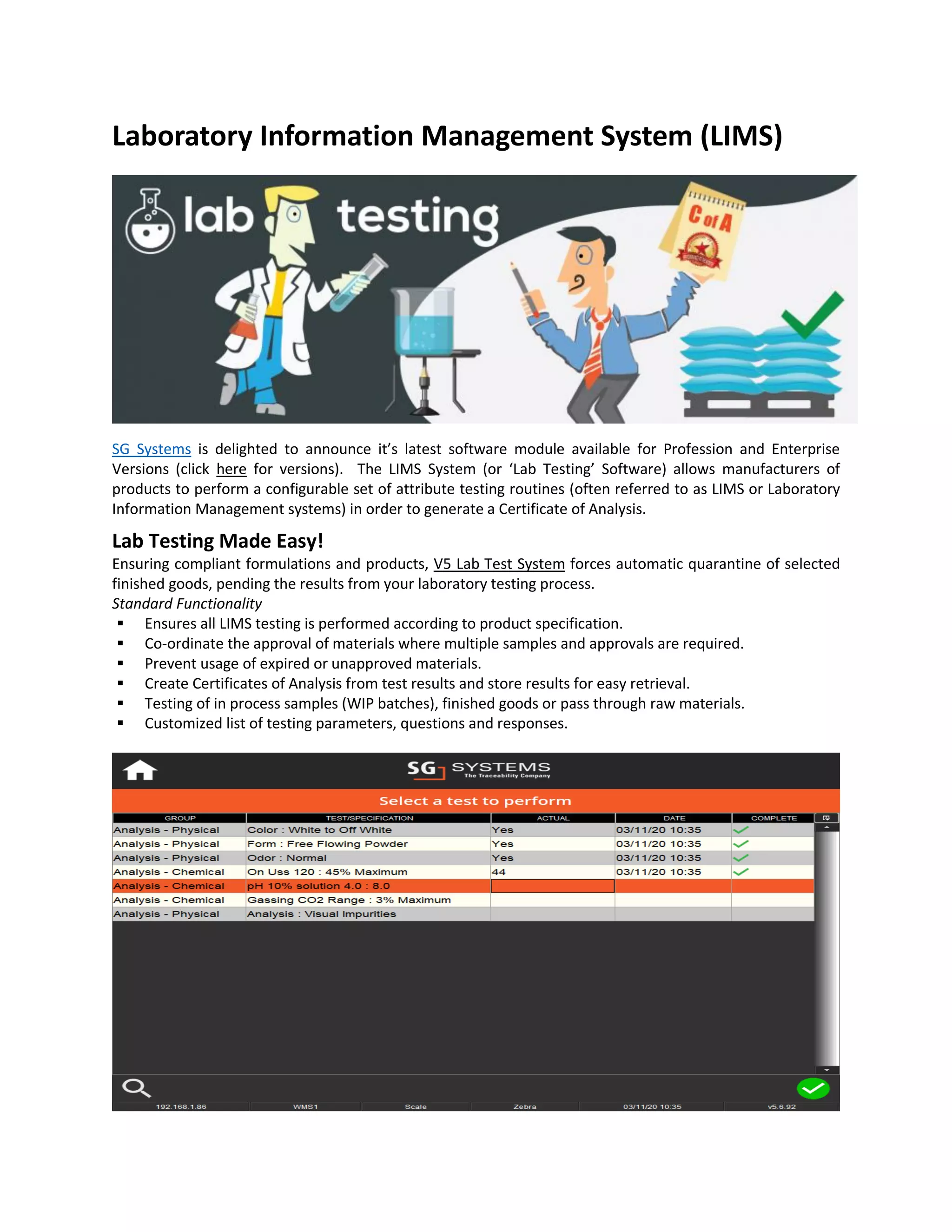 SG Systems has launched a new laboratory information management system (LIMS) module designed for professional and enterprise versions, facilitating configurable attribute testing and certificate generation. The software ensures compliance by automatically quarantining finished goods and managing testing processes with customizable parameters and result tracking. Key features include automated reporting, streamlined user interface, and robust printing options for efficient laboratory operations.