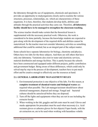 This document discusses proper laboratory management and safety. It emphasizes the importance of organizing equipment, chemicals, and teaching aids to ensure safe and effective use of the laboratory. Specific rules are outlined for chemical and equipment storage and labeling. The roles and responsibilities of the laboratory assistant are also described, including preparing materials for experiments, maintaining organization and cleanliness, and ensuring safety protocols are followed. The goal is to strengthen classroom teaching by facilitating practical activities in a managed and safe laboratory environment.