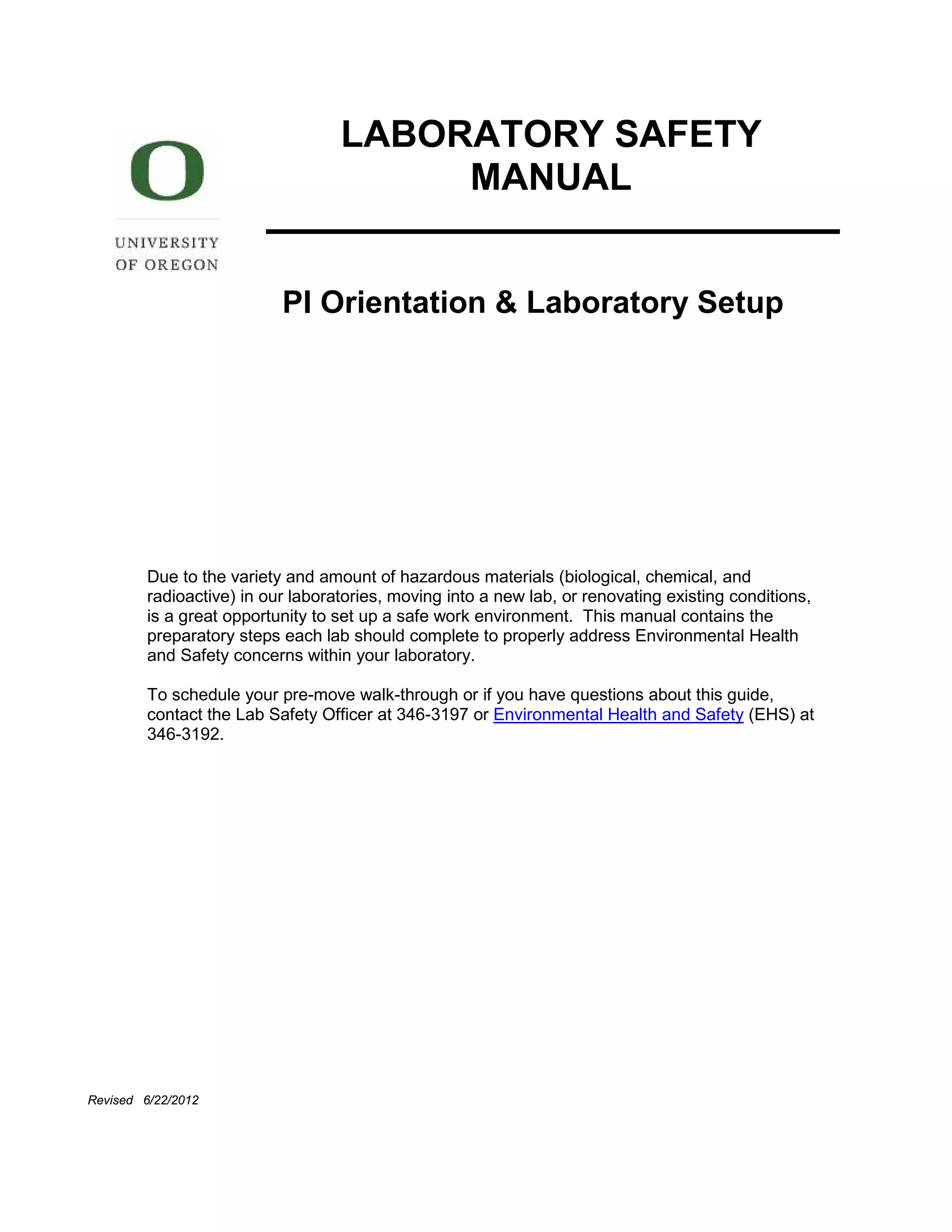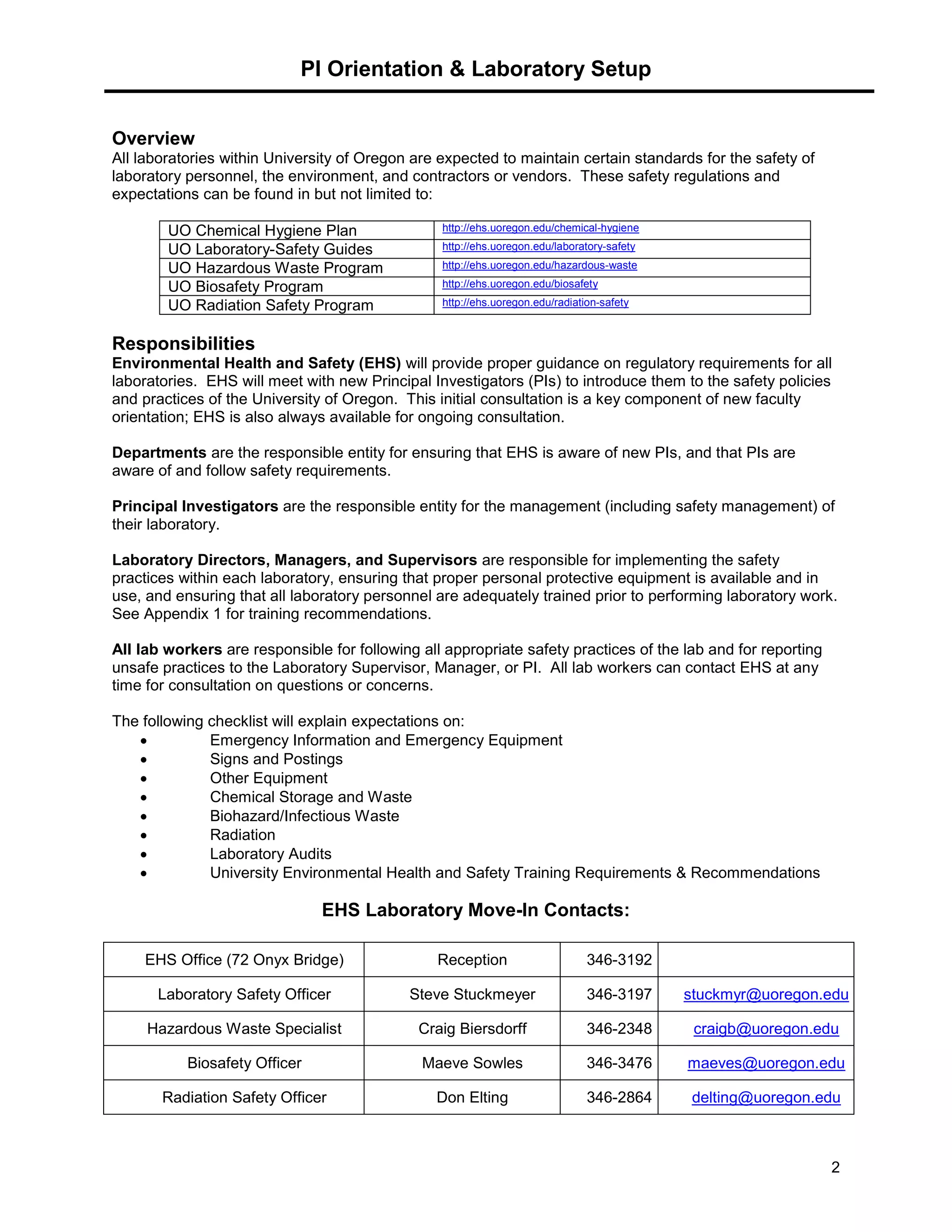 This document provides a checklist for laboratories moving into a new space or renovating their existing space to ensure proper safety protocols are followed. It outlines requirements for emergency equipment, signs, storage of chemicals and waste, and training. Laboratories are expected to maintain standards for safety, and the checklist provides steps to address requirements from the university's chemical hygiene plan, biosafety program, and other safety policies. Contact information is provided for the laboratory safety officer and other experts who can assist with the safety setup and compliance.