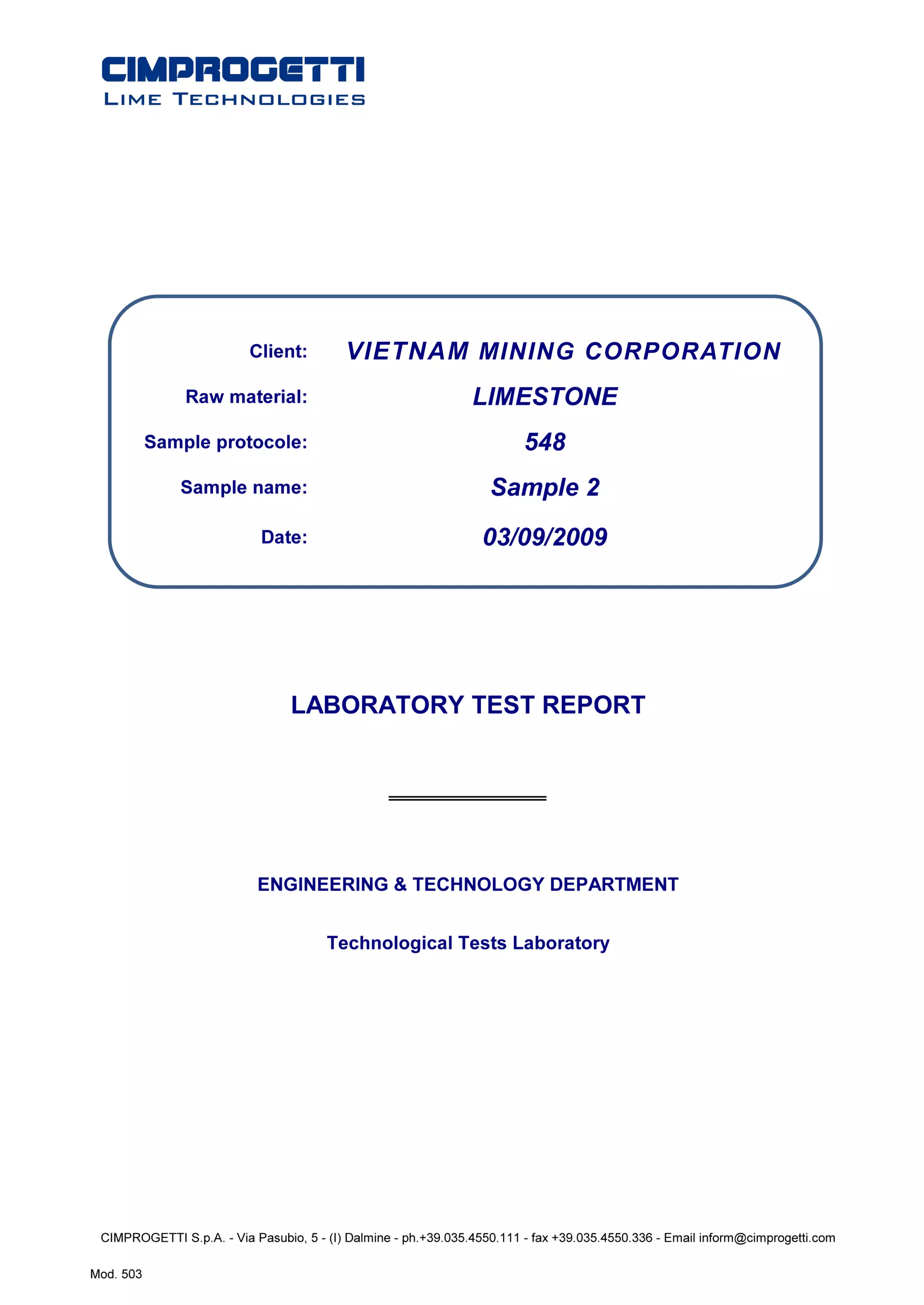 Il documento riguarda un rapporto di idoneità per un campione di calcare, fornendo informazioni sui test di laboratorio e le caratteristiche chimiche e fisiche del materiale. Risulta idoneo per l'uso nella pianta proposta, con un'elevata reattività e una composizione chimica accettabile. Vengono presentati risultati dettagliati sui test di degradazione, analisi chimiche e comportamento durante il riscaldamento.
