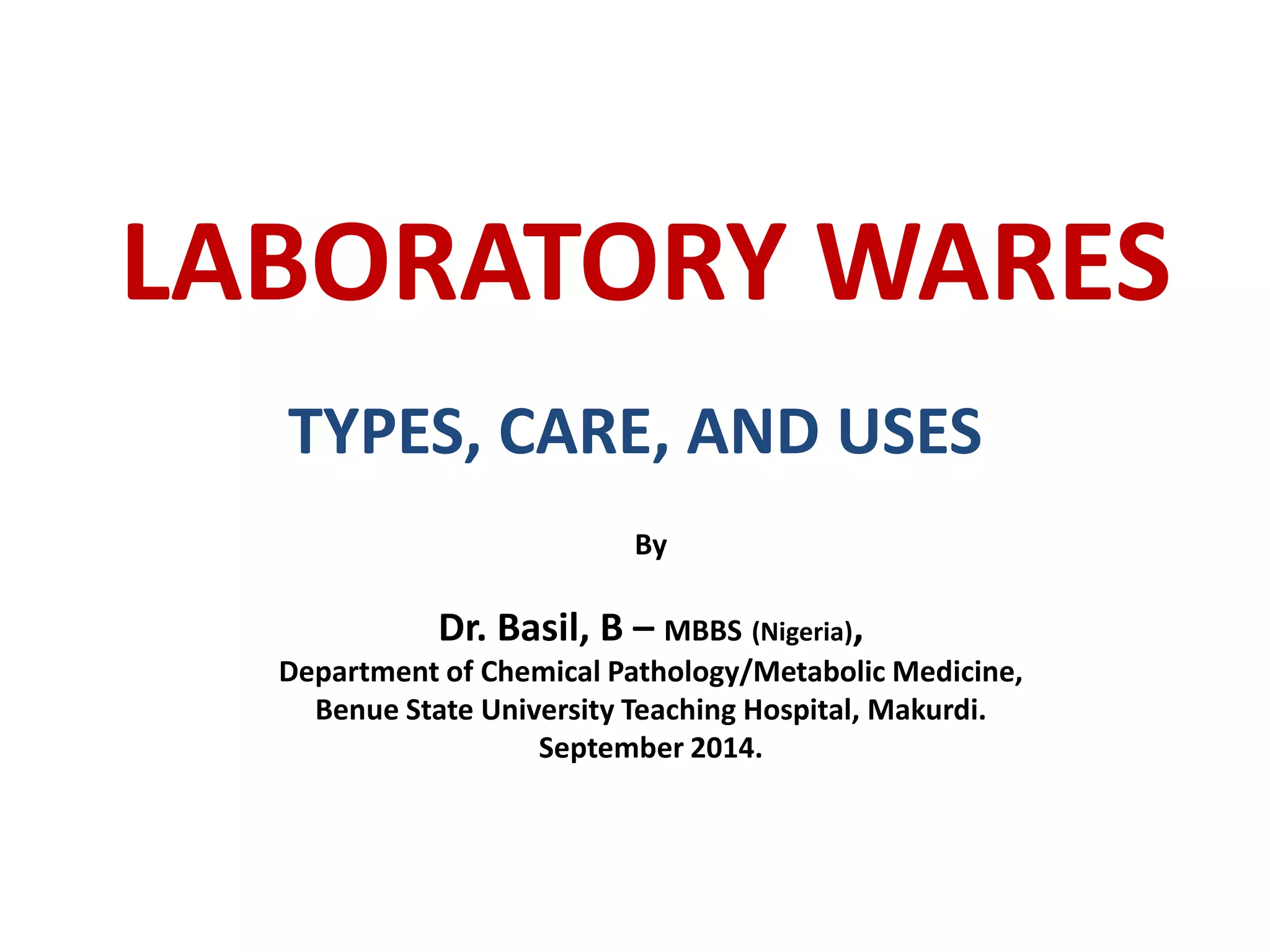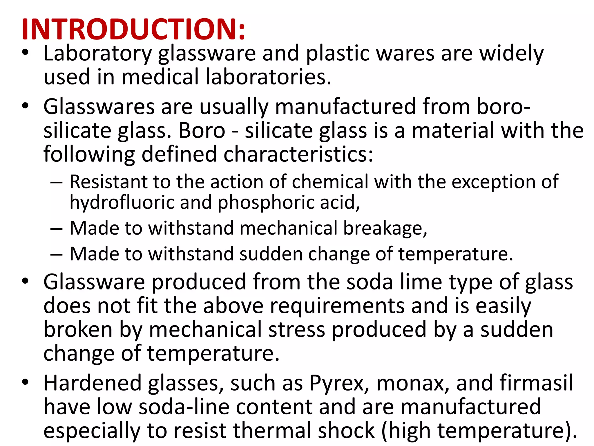 This document provides information on laboratory glassware and plasticware, including their types, care, and uses. It discusses the characteristics of borosilicate glass used to manufacture glassware and lists precautions for handling glassware. Various types of volumetric wares like pipettes, flasks, burettes, and cylinders are described. Recommendations are provided for cleaning glassware and plasticware to ensure they are thoroughly cleaned and free of contamination.
