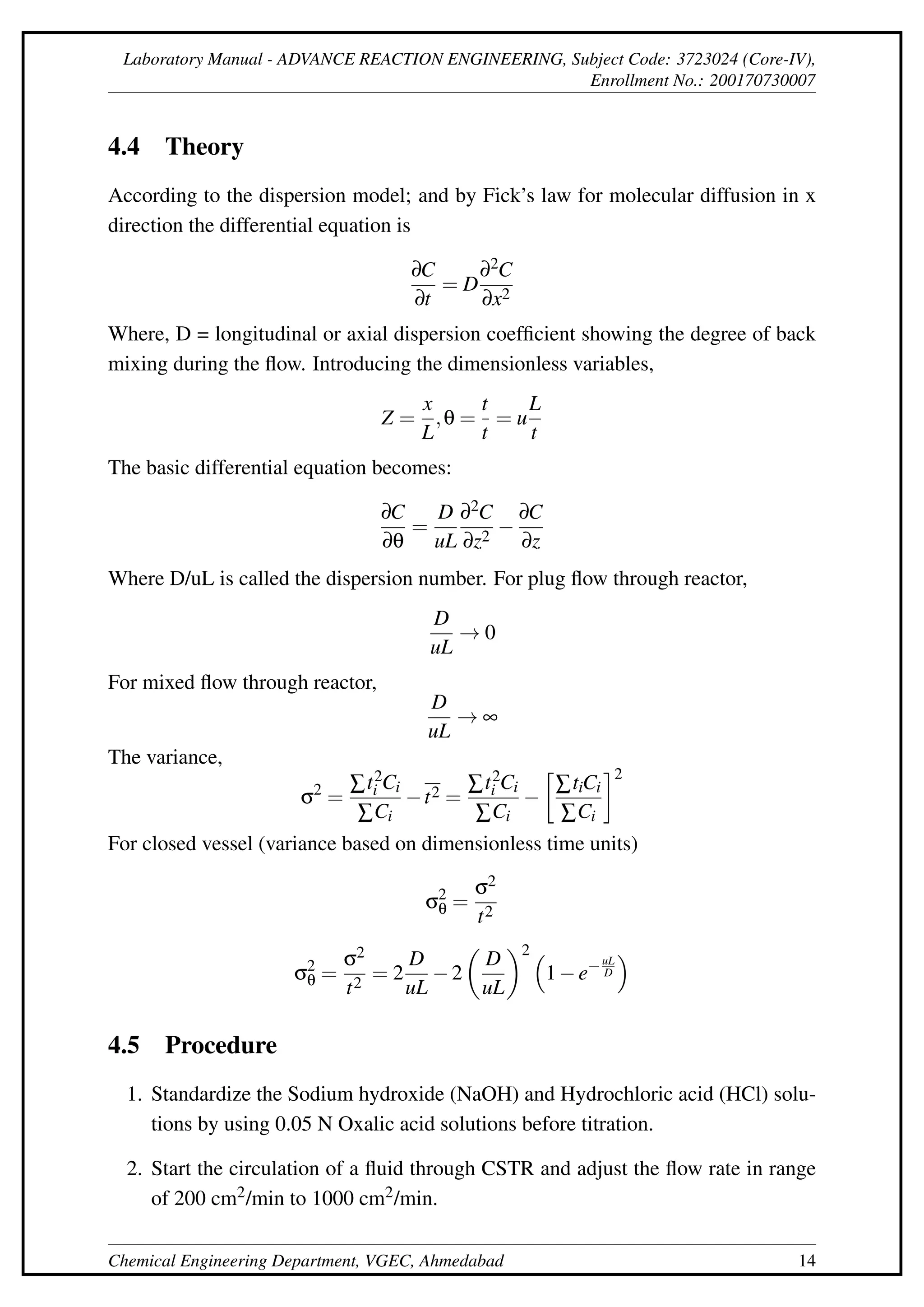 This document describes an experiment to determine the residence time distribution for a continuous stirred-tank reactor (CSTR) at different flow rates. Sodium hydroxide is injected as a tracer and samples are collected and titrated over time. Curves are constructed for concentration C(t), normalized concentration E(t), cumulative distribution F(t), and others. The dispersion number D/uL is calculated from these curves and found to initially decrease then increase with flow rate.