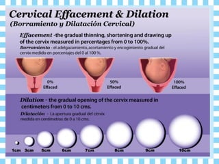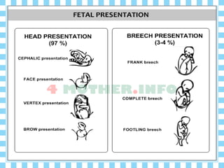 The document provides information on the stages of labor, including the three stages of the first stage (latent, active, transition), signs of each stage, and nursing care required. It also discusses factors that can influence the duration of labor like fetal position and size, as well as maternal health factors.