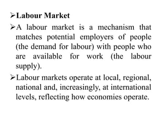 1. A labour market matches potential employers with available workers through supply and demand. Labour markets operate at local, regional, national and international levels.