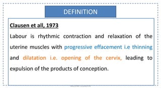 The document provides a comprehensive overview of the stages of labor, detailing the physiological processes during each stage, including first stage dilation, second stage expulsion of the fetus, and third stage expulsion of the placenta. It emphasizes the mechanisms of cervical dilation, uterine contractions, and the critical events that ensure the safe delivery of the fetus and placenta. Clinical management techniques and the importance of hormonal actions during labor are also highlighted.
