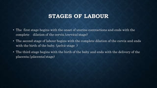 The document discusses various methods of labour analgesia including non-pharmacological techniques, systemic drugs, inhalational agents, epidural analgesia and spinal analgesia. It describes the stages of labour and mechanisms of labour pain. For epidural analgesia, it recommends bupivacaine with lipid-soluble opioids like fentanyl or sufentanil. It outlines administration techniques and discusses complications and fetal effects for different analgesic methods.