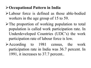 This document discusses trends in India's labor force and occupational patterns from 1901 to 2011 based on census data. Some key points: