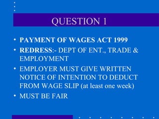 The document contains answers to 13 questions on various aspects of labour law in Ireland. It discusses laws around payment of wages, health and safety in the workplace, entitlement to paid time off for reasons such as sick leave, maternity leave, caring responsibilities, jury duty, and discrimination. Key acts mentioned include the Payment of Wages Act, Safety, Health and Welfare at Work Act, Maternity Protection Act, Carer's Leave Act, Employment Equality Act, and Juries Act. The document provides information on employees' rights and avenues for redress such as rights commissioners or labour courts in cases of disputes with employers.