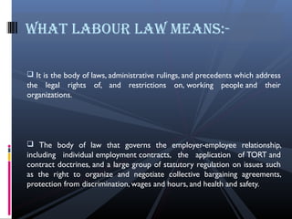 Labour law governs the legal rights of workers and their organizations. It addresses issues like the right to organize unions, protections from discrimination, wages and hours, and health and safety. Labour law has evolved from the industrial revolutions of the 18th century onward. Early landmarks included laws protecting child labourers in the early 19th century. The International Labour Organization was formed in 1919 to promote social justice and workers' rights globally. It establishes labour standards and conventions. May 1st became an international workers' day to commemorate the fight for an eight hour workday.