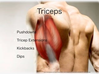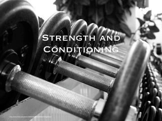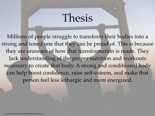 The document provides information on strength training and conditioning. It discusses topics like nutrition, different types of workouts that target specific muscle groups, supplements, and sample workout programs. The goal is to educate people on how to transform their bodies through proper nutrition, exercises, and strength training routines in order to gain muscle and improve overall fitness and health.