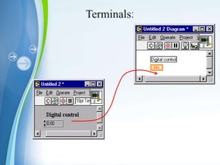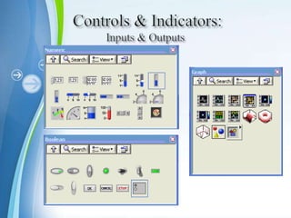 This document provides an overview of LabVIEW, including its software, instrumentation, control systems applications, and advantages. LabVIEW is a graphical programming language that uses icons instead of text. It was developed by National Instruments in 1988 and is used widely by scientists and engineers. The program, called a virtual instrument or VI, contains a front panel user interface and block diagram code. Wiring between functions uses different styles for varying data types.