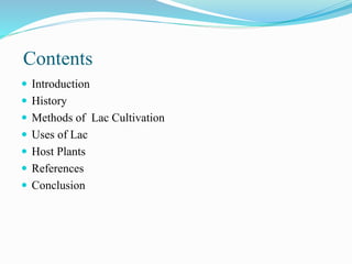 Lac is a resinous secretion produced by lac insects that is cultivated for commercial use. The document outlines the history, cultivation methods, host plants, and uses of lac. Key points include that lac cultivation involves selecting and pruning host trees, inoculating them with broodlac bundles, harvesting immature resin or mature broodlac, and that the main host plants are Butea monosperma, Ziziphus mauritiana, and Flemigia semialata. Lac has various applications in products like paints, electrical goods, and cosmetics.