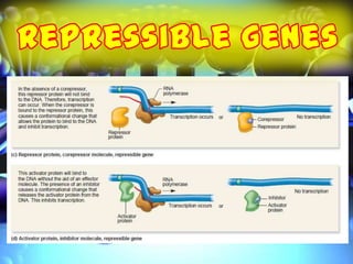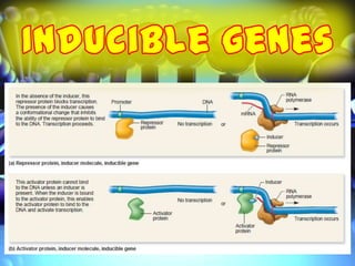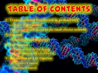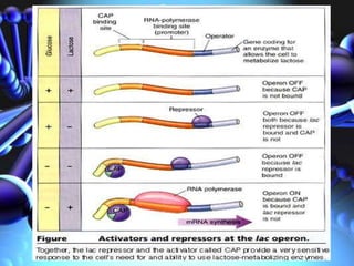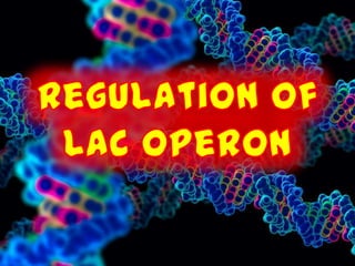 The document discusses gene regulation and the lactose operon. It defines positive and negative control of gene expression, where activator and repressor proteins respectively allow or hinder transcription. The lactose operon was the first discovered operon in E. coli and contains three genes for lactose metabolism. It is regulated by the lactose repressor protein which provides negative control and the catabolite activator protein which enables positive control and transcription in the presence of lactose.
