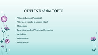 The document outlines the importance and components of lesson planning, emphasizing its role as a daily guide for teachers and a path to student achievement. Key components include well-defined objectives, assessments, engaging activities, various teaching strategies, and creating an optimal learning environment. It highlights the need for alignment between assessments and objectives, and recommends incorporating differentiated and personalized learning approaches.