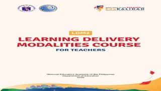 This document provides an overview and introduction to the Learning Delivery Modality Course 2 (LDM2) for teachers. The course aims to support teachers in preparing for new learning delivery modalities in their schools. It consists of 5 modules that will help teachers effectively manage the teaching and learning process. Teachers will learn through self-paced modules and collaborate through Learning Action Cells (LACs) facilitated by instructional coaches. The course acknowledges support from various partners and aims to ensure quality education despite current challenges.